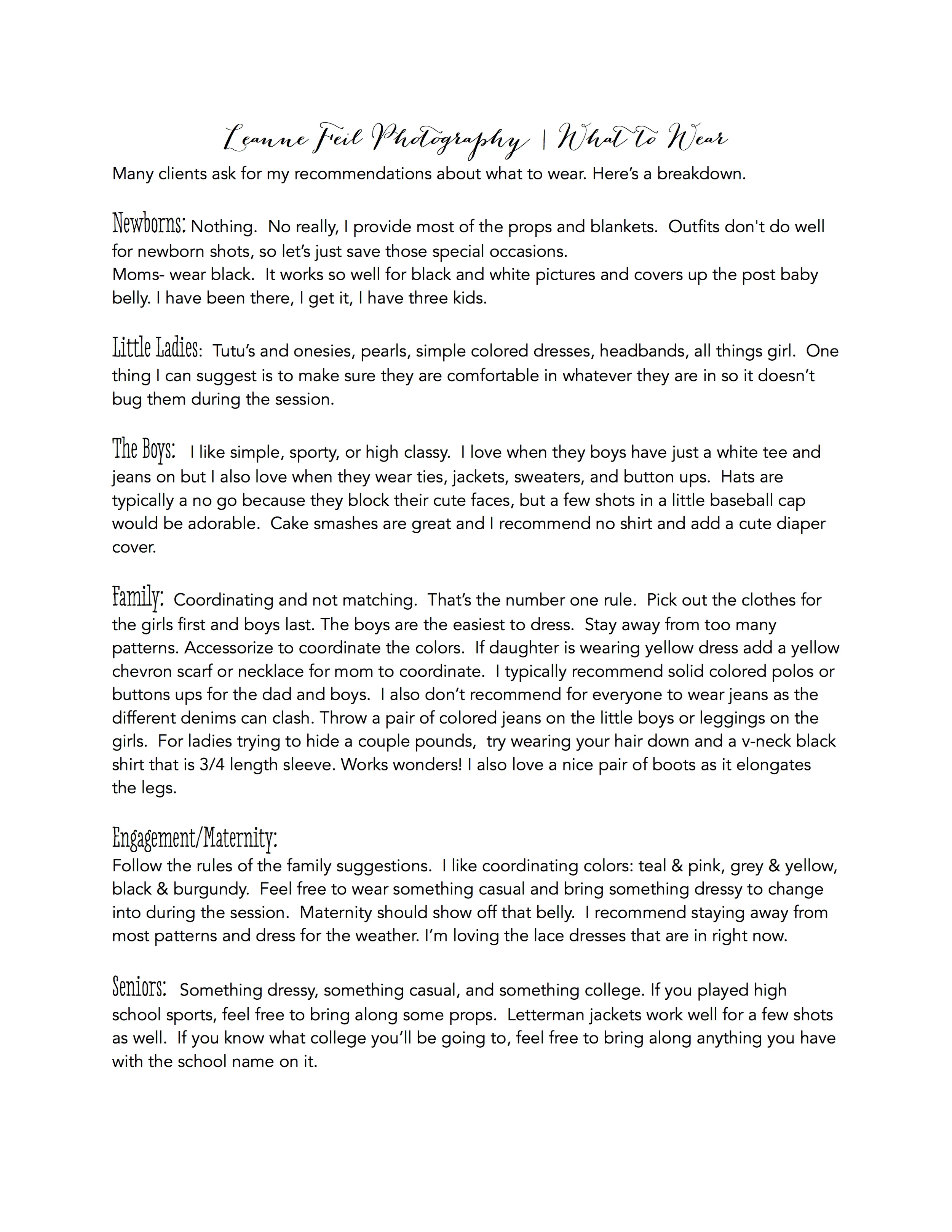 Need more inspiration? Check out my Pinterest board: http://www.pinterest.com/LeanneFeilPhoto/lfp-what-to-wear/